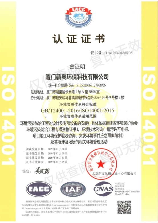 環(huán)境管理體系認(rèn)證證書