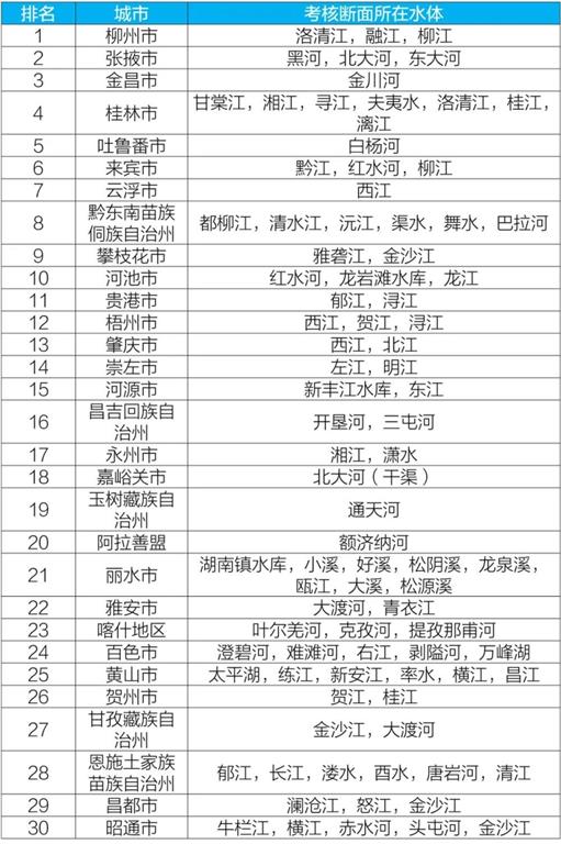 2020年1-10月國家地表水考核斷面水環(huán)境質(zhì)量狀況排名前30位城市及所在水體