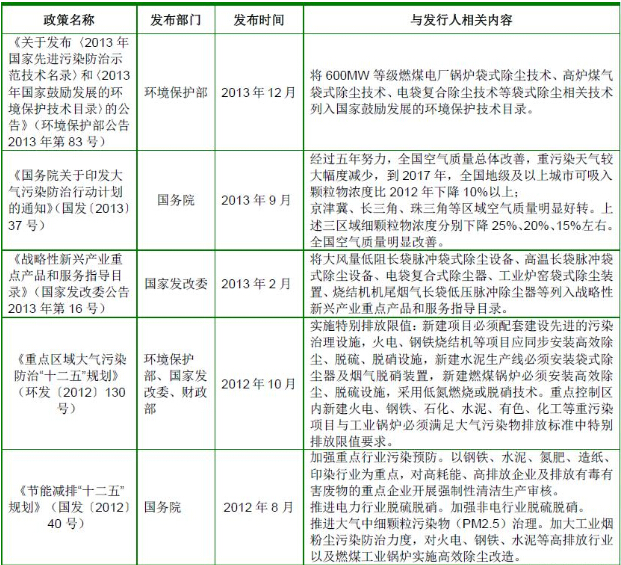 根據(jù)《國務(wù)院關(guān)于印發(fā)大氣污染防治行動(dòng)計(jì)劃的通知》(國發(fā)〔2013〕37號(hào))的要求,到2017 年,全國地級(jí)及以上城市可吸入顆粒物濃度比2012 年下降10%以上;京津冀、長三角、珠三角等區(qū)域細(xì)顆粒物濃度分別下降25%、20%、15%左右;加快重點(diǎn)行業(yè)脫硫、脫硝、除塵改造工程建設(shè)。所有燃煤電廠、鋼鐵企業(yè)的燒結(jié)機(jī)和球團(tuán)生產(chǎn)設(shè)備、石油煉制企業(yè)的催化裂化裝置、有色金屬冶煉企業(yè)都要安裝脫硫設(shè)施,每小時(shí)20 蒸噸及以上的燃煤鍋爐要實(shí)施脫硫。除循環(huán)流化床鍋爐以外的燃煤機(jī)組均應(yīng)安裝脫硝設(shè)施,新型干法水泥窯要實(shí)施低氮燃燒技術(shù)改造并安裝脫硝設(shè)施。燃煤鍋爐和工業(yè)窯爐現(xiàn)有除塵設(shè)施要實(shí)施升級(jí)改造;京津冀、長三角、珠三角等區(qū)域要于2015 年底前基本完成燃煤電廠、燃煤鍋爐和工業(yè)窯爐的污染治理設(shè)施建設(shè)與改造,完成石化企業(yè)有機(jī)廢氣綜合治理。